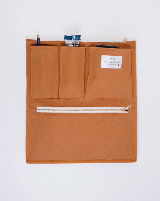 Every Lark bag is fully lined with natural cotton muslin and includes a snap-closure pocket for quick-access essentials. Inside, you’ll find strategically placed snaps designed to securely hold our optional organizers and water bottle holder—so you can customize your carry. It will fit a 17" laptop comfortably.