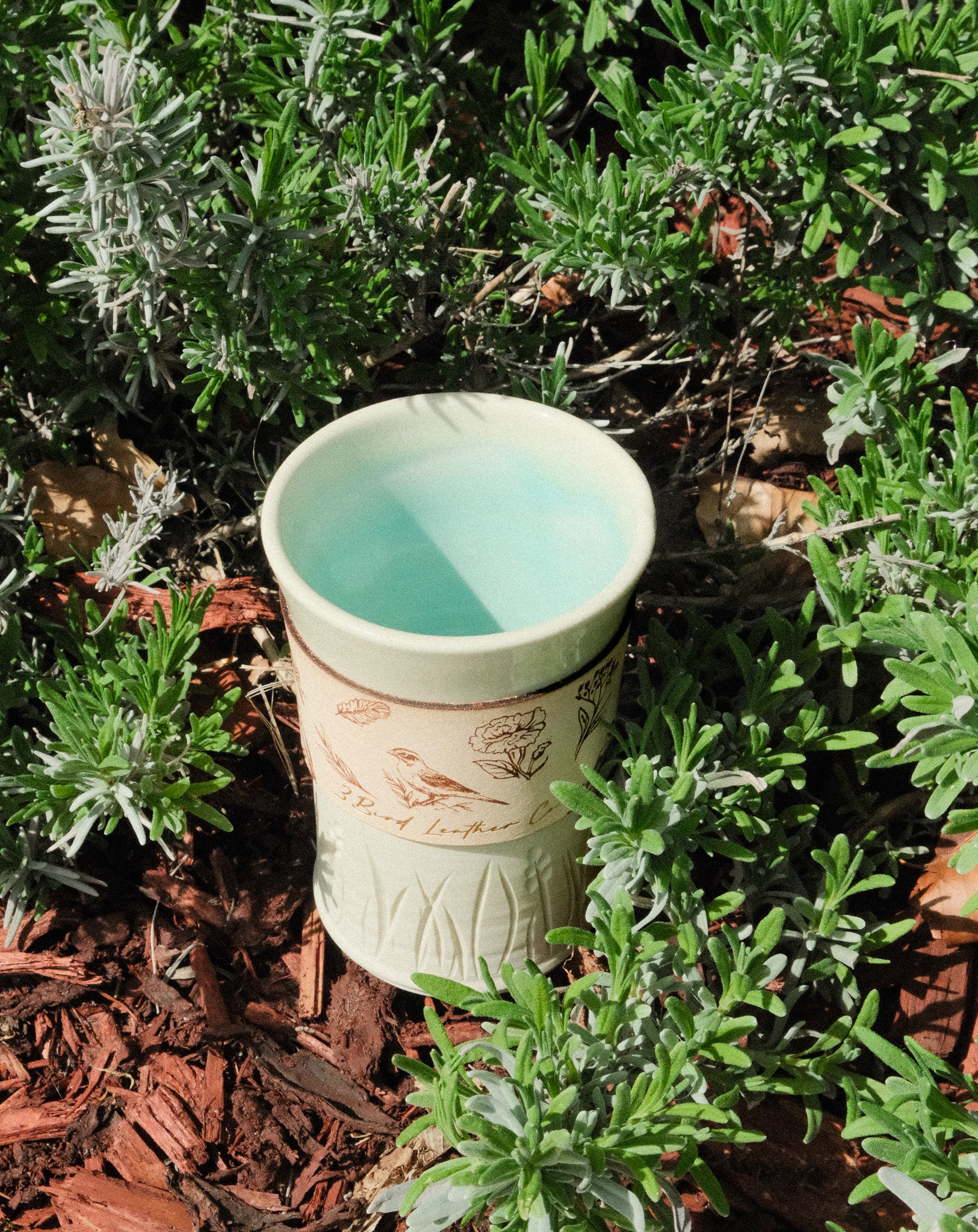 We wrapped each mug in natural, undyed Italian leather, engraved with wildflowers and our favourite birdies.